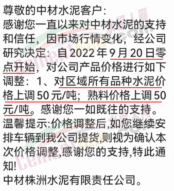 中材株洲水泥有限責(zé)任公司通知因市場行情變化,經(jīng)公司研究決定自2022年9月20日零點開始,對區(qū)域所有品種水泥價格上調(diào)50元/噸,熟料價格上調(diào)50 元/噸。