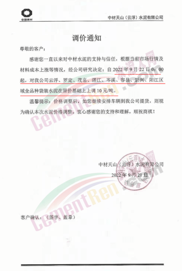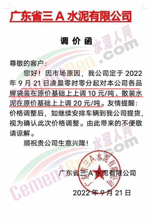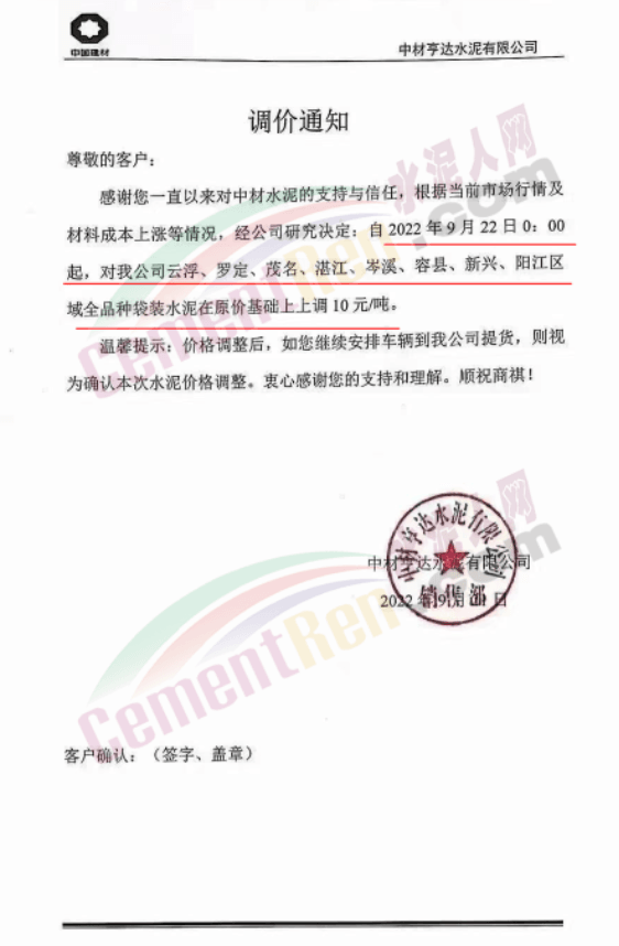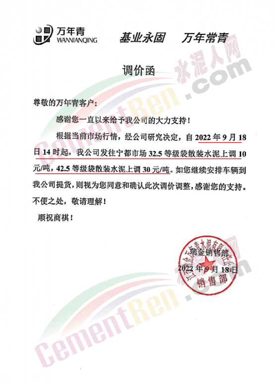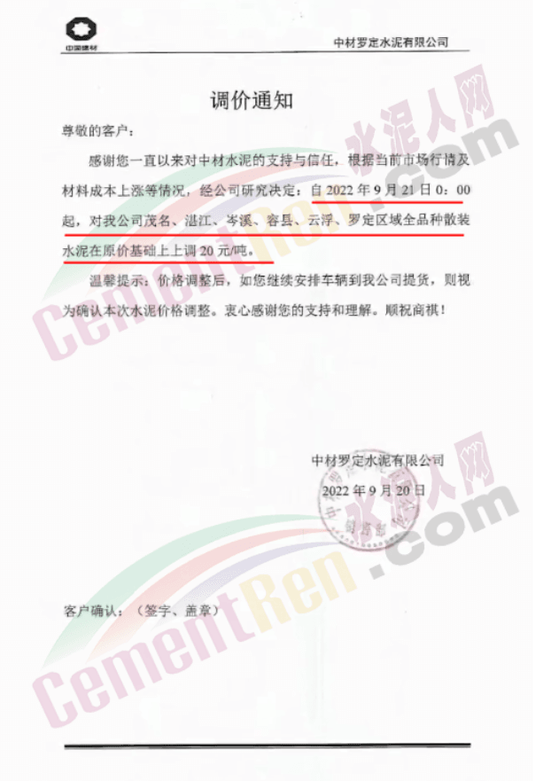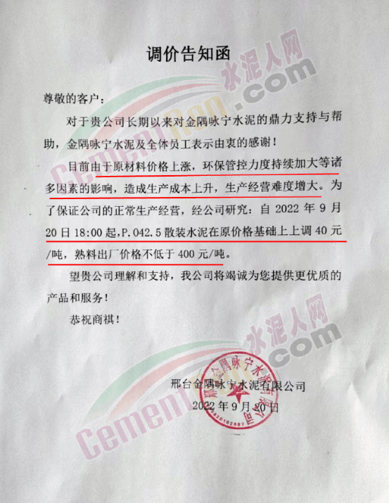 同期,河北多地主要品牌企業(yè)通知再次上調水泥價格。邢臺金隅詠寧水泥通知目前由于原材料價格上漲,環(huán)保管控力度持續(xù)加大等諸多因素的影響,造成生產成本上升,生產經營難度增大。為了保證公司的正常生產經營,經公司研究,自2022年9月20日18∶00起,P.O42.5散裝水泥在原價格基礎上上調40元/噸,熟料出廠價格不低于400元/噸。