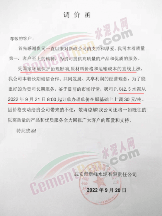 武安新峰水泥通知,受國家環(huán)境保護治理影響,原材料價格和運輸成本直線上漲,鑒于目前的市場行情,公司P.O42.5水泥從2022年9月21日8∶00起訂單辦理單價在原基礎上上調30元。