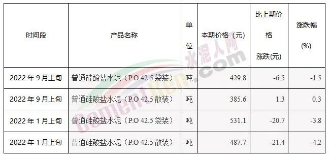 國家統(tǒng)計局數據顯示,今年1月上旬至9月上旬,流通領域普通硅酸鹽水泥(P.O 42.5散裝)價格下跌了102.1元/噸,普通硅酸鹽水泥(P.O 42.5袋裝)價格下跌了101.3元/噸,均超過100元/噸。