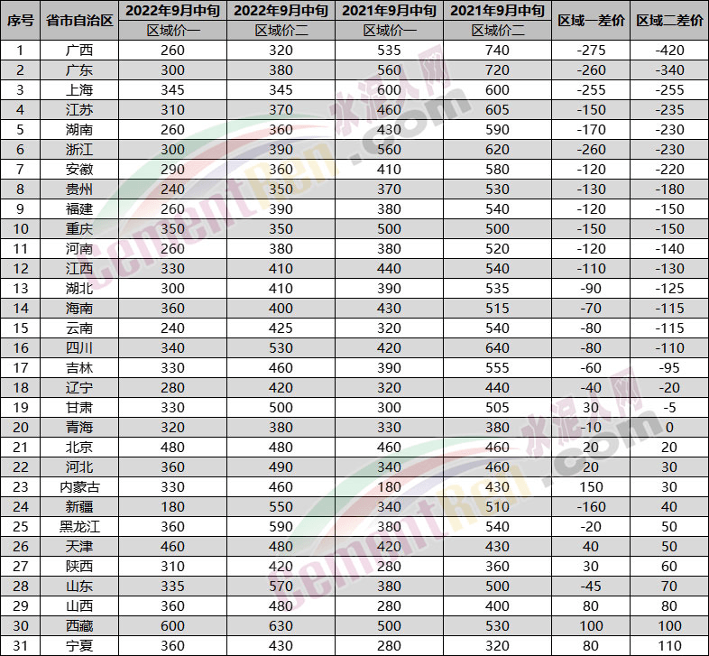 半數以上的區(qū)域水泥價格同比上年下跌,疊加煤炭價格仍較堅挺,且多區(qū)域即將進入四季度趕工期,水泥需求或將出現小幅增加,各大水泥企業(yè)復價意愿強烈,水泥價格有望進入上行通道。