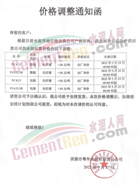 英德市恒業(yè)建材有限公司發(fā)布通知稱:自2022年9月27日零時起,我公司生產(chǎn)的P.P32.5R包裝水泥出廠價格上調(diào)20元/噸;P.P32.5R散裝水泥出廠價格上調(diào)20元/噸; M32.5包裝水泥出廠價格上調(diào)20元/噸。