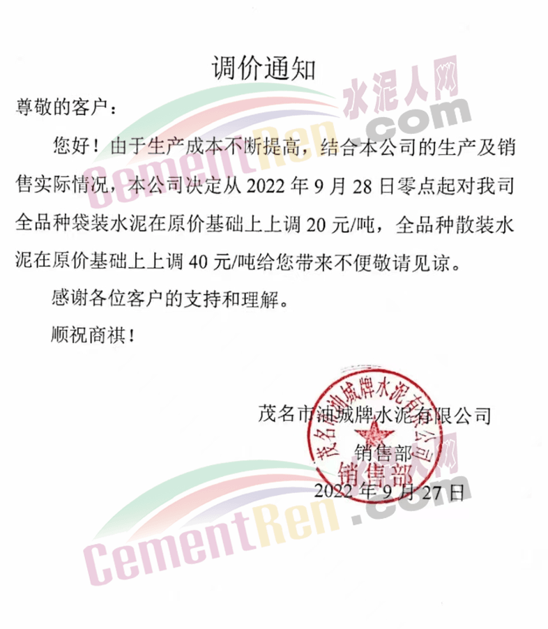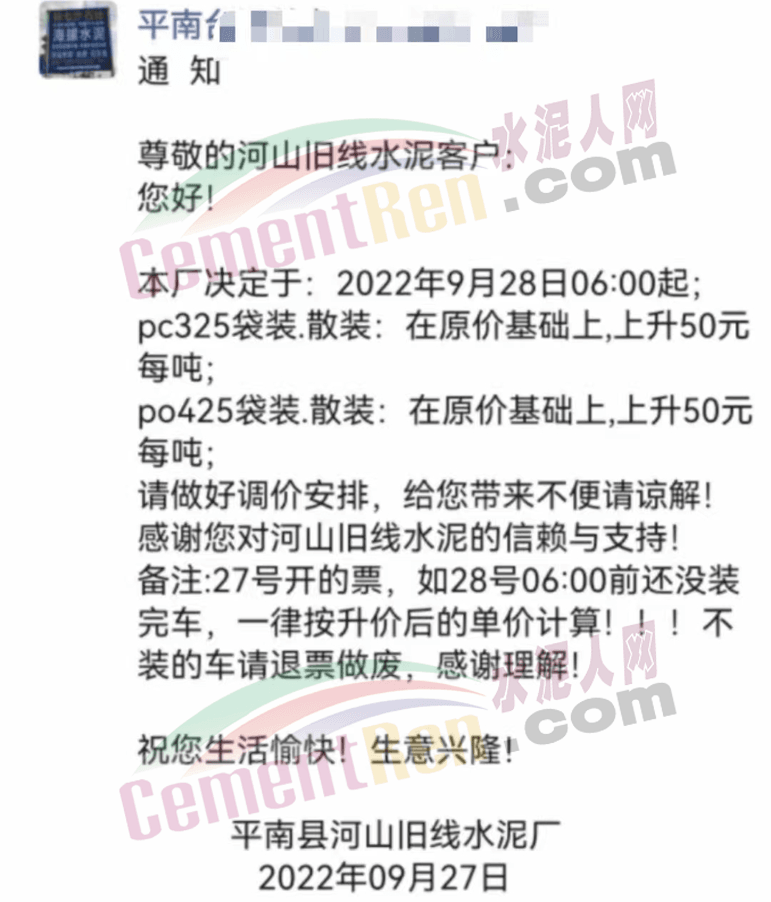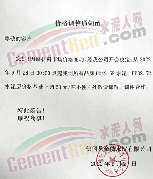佛岡縣金峰水泥有限公司發(fā)布通知稱:因原材料市場價格變動,從2022年9月28日00:00起,我司所有品牌PO42.5R水泥、PP32.5R水泥原價格基礎(chǔ)上上調(diào)20元/噸。