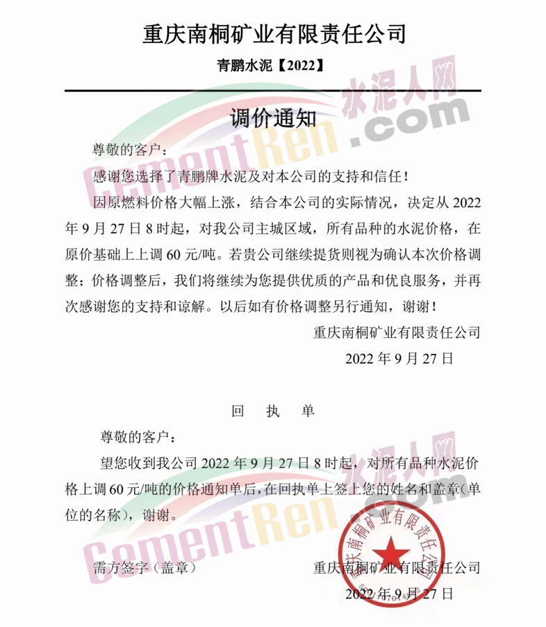重慶南桐礦業(yè)有限責(zé)任公司發(fā)布通知稱:因原燃料價格大幅度上漲,結(jié)合本公司的實(shí)際情況,決定從2022年9月27日8時起,對我公司主城區(qū)域,所有品種的水泥價格,在原價格基礎(chǔ)上上調(diào)60元/噸。