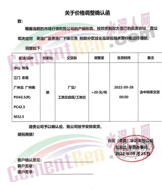臺泥(英德)水泥有限公司發(fā)布通知稱:自2022年9月28日0時起,銷往中山、珠海、江門、東莞、廣州北、廣州南PO42.5R、PC42.5、M32.5袋裝水泥價格上調(diào)20元/噸。