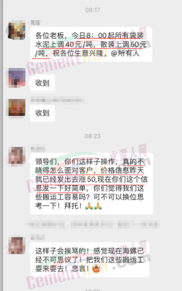 海螺水泥經(jīng)銷商打款群里通知調(diào)價的信息是在8點17分,通知是自8點起上調(diào)40-50元/噸。前一日司機群里的通知是“25日8時上調(diào)50元/噸,后經(jīng)研討決定,改為26日8點各品種上調(diào)30元/噸。”