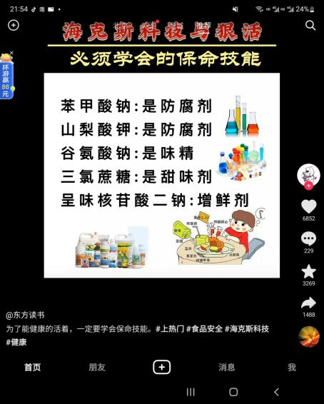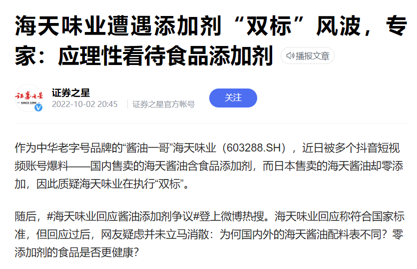 隨著“海克斯科技”視頻博主辛吉飛的持續(xù)爆料,越來越多的產(chǎn)品出現(xiàn)在觀眾眼前。辛吉飛拍了一個制作勾兌醬油的方法,雖然沒指名道姓,但大家還是聯(lián)想到了“醬油一哥”海天味業(yè)。此后,多個抖音短視頻賬號爆料——國內(nèi)售賣的海天醬油含食品添加劑,而日本售賣的海天醬油卻零添加,因此質(zhì)疑海天味業(yè)在執(zhí)行“雙標(biāo)”。