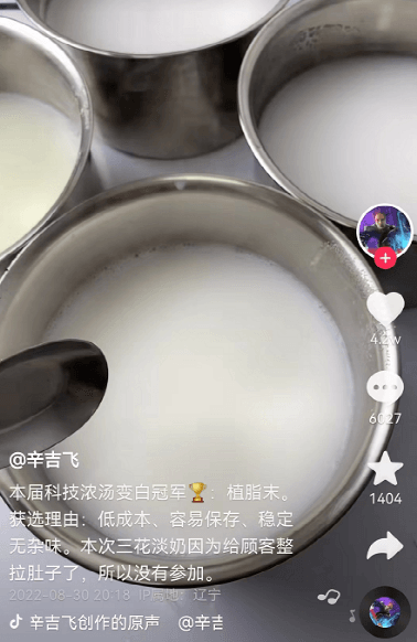 自己制作的羊雜湯之所以是奶白色,需要用牛骨燉煮很長時間,結(jié)果該博主直接在清水中加入“一勺三花淡奶”就調(diào)制出了濃稠奶白色的湯。一時間,“師傅熬高湯七個小時,我一勺三花淡奶加雞精顧客直呼童年味道”的說法火遍全網(wǎng)。