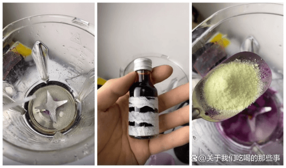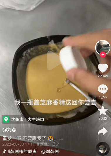 另一位“美食博主”劉慫也為大家?guī)砹?ldquo;科技食物”的詳細(xì)制作方法。普通的一勺花生醬,加點自來水,加點食用油,加點焦糖色素,加點芝麻香精后,一碗外面賣的芝麻醬就做好了。