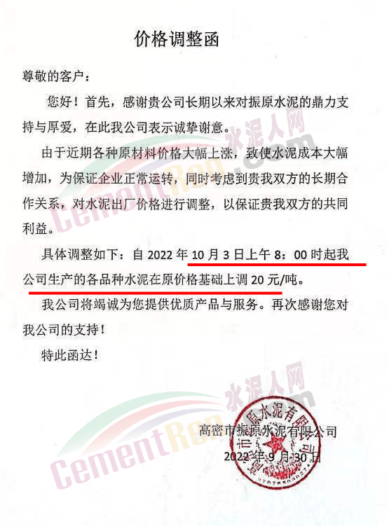 高密市振原水泥有限公司通知,由于近期各種原材料價格大幅上漲,致使水泥成本大幅增加,為保證企業(yè)正常運轉(zhuǎn),自10月3日上午8時起,對水泥出廠價格上調(diào)20元/噸。