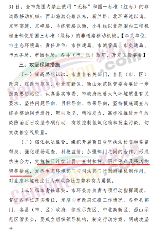 攻堅保障措施不僅要求強(qiáng)化執(zhí)法監(jiān)管。實施按日連續(xù)計罰、查封扣押、限產(chǎn)停產(chǎn)及移送拘留等措施,發(fā)揮生態(tài)環(huán)境部門與司法部門行刑銜接機(jī)制作用,對生態(tài)環(huán)境違法行為形成高壓態(tài)勢和有力震懾。同時,強(qiáng)化輿論引導(dǎo)。由市委宣傳部牽頭,緊緊圍繞全市大氣污染防治工作,開展形式多樣的環(huán)境保護(hù)宣傳活動,提升全民環(huán)境保護(hù)意識。充分發(fā)揮媒體作用,及時曝光突出環(huán)境問題和整改情況。完善監(jiān)督舉報、環(huán)境公益訴訟等機(jī)制,鼓勵和引導(dǎo)環(huán)保社會組織和公眾參與大氣污染監(jiān)督治理。