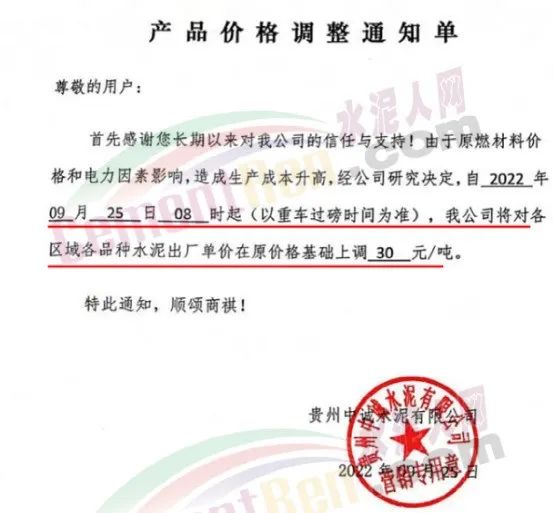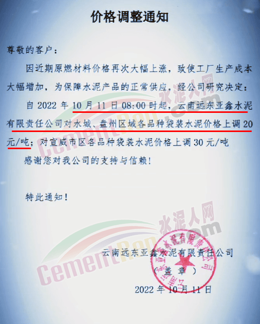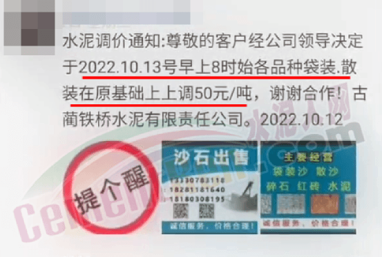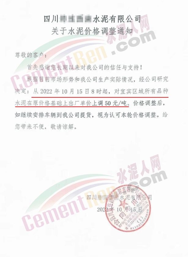 日前,四川某水泥企業(yè)通知自10月15日8時起,對宜區(qū)域所有品種水泥價格上調(diào)50元/噸,價格調(diào)整后,如繼續(xù)安排車輛到公司提供,則視為認(rèn)可本輪價格調(diào)整。