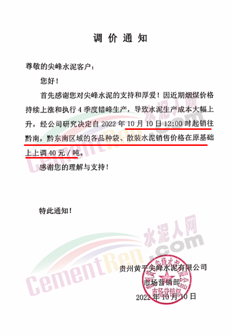 貴州中誠水泥分別于9月25日和10月11日兩次上調(diào)水泥價格30元/噸、40元/噸,累計上調(diào)70元/噸。