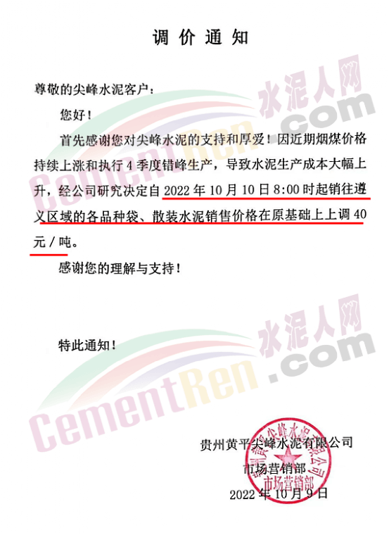 貴州黃平尖峰分別于10月10日和13日通知上調(diào)貴州黔南、黔東南、遵義以及湖南區(qū)域水泥價格40元/噸。9月初企業(yè)還曾針對貴州區(qū)域市場上調(diào)30元/噸,兩次累計上調(diào)60-70元/噸。