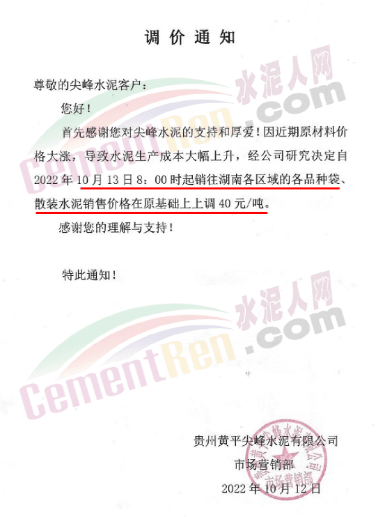 棗陽市冠鴻建材有限公司通知10月12日起PP32.5水泥上調(diào)40元/噸。