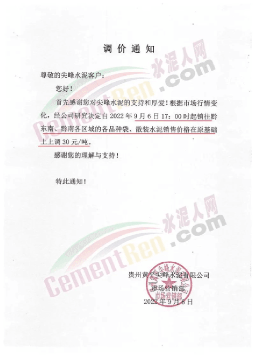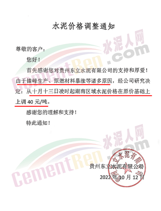 貴州余慶東立水泥分別于9月7日、10月12日通知上調(diào)水漲價格30元/噸,兩次累計上調(diào)60元/噸。
