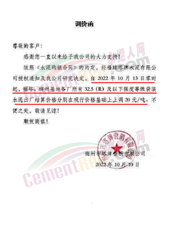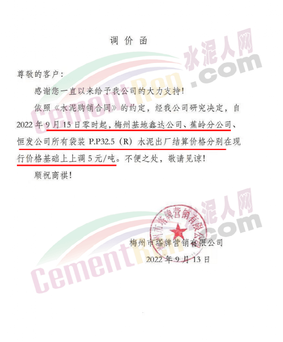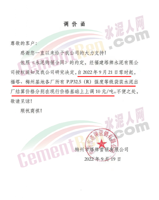 廣東梅州市塔牌營銷有限公司分別于9月15日、9月21日、10月13日上調(diào)袋裝P.P32.5(R)水泥出廠價5元/噸、10元/噸、20元/噸,三次累計上調(diào)35元/噸。