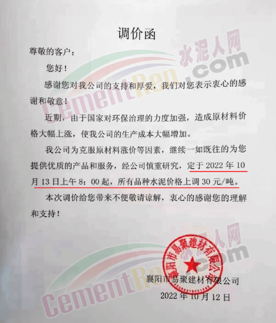 襄陽市易聚建材有限公司通知,為克服原材料漲價等因素,定于10月13日上午8時上午8時所有品種水泥上調(diào)30元/噸。