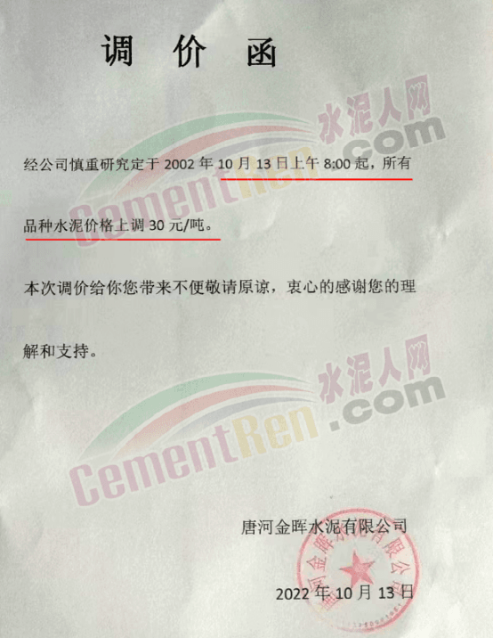 河南南陽唐河金暉水泥有限公司通知10月13日上午8時起,所有品種水泥價可行上調(diào)30元/噸。
