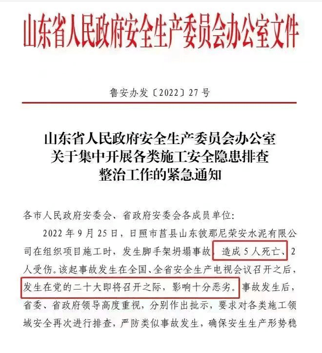 2022年9月25日,日照市莒縣山東彼那尼榮安水泥有限公司在組織項目施工時,發(fā)生腳手架坍塌事故,造成5人死亡、 2人受傷。該起事故發(fā)生在全國、全省安全生產(chǎn)電視會議召開之后,影響十分惡劣。