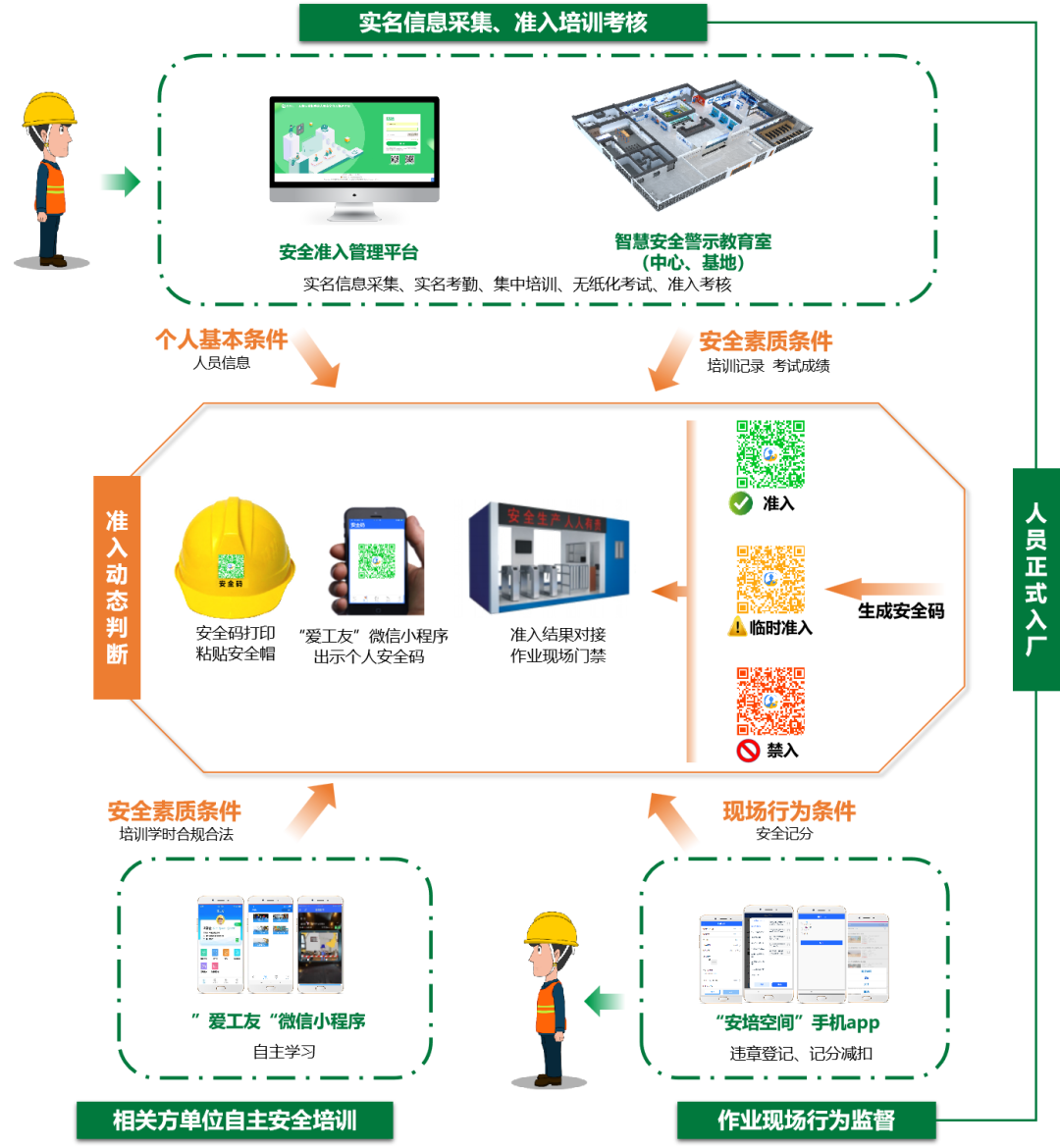 水泥企業(yè)相關(guān)方人員安全準入管理解決方案 ,以相關(guān)方人員“個人基本條件+安全素質(zhì)條件+現(xiàn)場行為條件”為依據(jù),綜合研判相關(guān)方人員準入狀態(tài),生成安全碼,人因風(fēng)險等級可視化。同時通過智慧安全警示教育室、安全準入管理平臺、“愛工友”微信小程序等用于人員信息采集、準入培訓(xùn)考核、作業(yè)行為監(jiān)督,嚴控相關(guān)方人員安全準入,降低人因安全風(fēng)險,減少安全事故的發(fā)生。