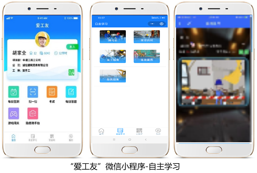企業(yè)相關(guān)方人員可使用“愛工友”微信小程序 進行簽到考試和自主學(xué)習(xí),內(nèi)含豐富的學(xué)習(xí)資源,包括安全微電影、安全百科知識、事故案例、隱患圖集以及安全小游戲等。