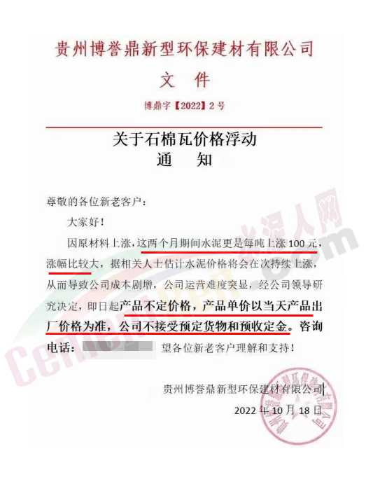 貴州博譽鼎新型環(huán)保建材有限公司發(fā)《關(guān)于石棉瓦價格浮動通知》稱,因原材料上漲,這兩個月期間水泥更是每噸上漲100元,漲幅比較大,導(dǎo)致公司成本劇增,公司運營難度凸顯。經(jīng)公司領(lǐng)導(dǎo)研究決定,即日起產(chǎn)品不定價格,產(chǎn)品單價以當(dāng)天產(chǎn)品出廠價格為準(zhǔn),公司不接受預(yù)定貨物和預(yù)收定金。