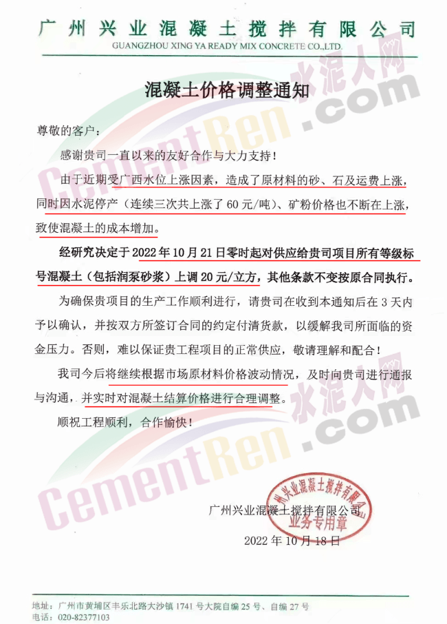 廣州興業(yè)混凝土攪拌有限公司通知稱,由于近期受廣西水位上漲因素,造成原材料的砂、石及運費上漲同時因水泥停產(chǎn)(連續(xù)三次共上漲了60元/噸)、礦粉價格也不斷在上漲,致使混凝土的成本增加。經(jīng)研究決定于10月21日起所有等級標(biāo)號混凝土(包括潤泵砂漿)上調(diào)20元/立方。公司今后將繼續(xù)根據(jù)市場原材料格波動情況實時對混凝土結(jié)算價格進(jìn)行合理調(diào)整。