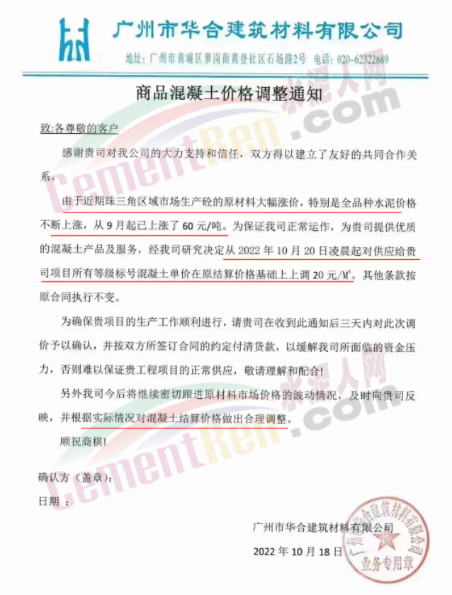 廣州市華合建筑材料有限公司通知,由于近期珠三角區(qū)域市場生產(chǎn)砼的原材料大幅漲價,特別是全品種水泥價格不斷上漲,從9月起已經(jīng)漲了60元/噸,為保證公司正常運作,從10月20日凌晨起對所有等級標(biāo)號混凝土單價在原結(jié)算價格基礎(chǔ)上上調(diào)20~30元/方。