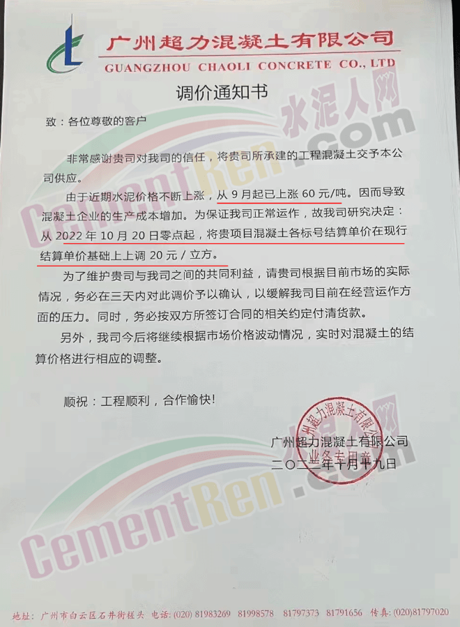 廣州超力混凝土有限公司調(diào)價通知書稱,由于近期水泥價格不斷上漲,從9月起已上漲60元/噸,因而導(dǎo)致混凝土企業(yè)的生產(chǎn)成本增加。為保證公司正常運作,經(jīng)公司研究決定從10月20日零點起,將各標(biāo)號混凝土結(jié)算價格上調(diào)20元/立方。今后將繼續(xù)根據(jù)市場價格波動情況,實時對混凝土的結(jié)算價格進(jìn)行相應(yīng)的調(diào)整。