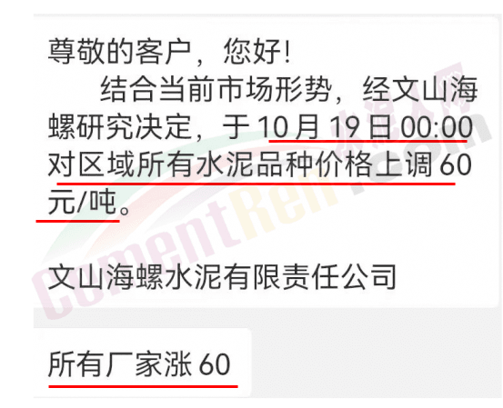 文山海螺水泥有限公司通知19日0時起對所有區(qū)域所有水泥品種價格上調(diào)60元/噸。經(jīng)銷商通知稱,“所有廠家漲60元/噸”。