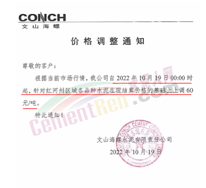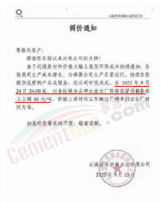 據(jù)水泥人網(wǎng)了解,9月下旬,云南普洱西南水泥有限公司曾通知,由于近期原材料價格大幅上漲及環(huán)保成本持續(xù)增加,導(dǎo)致公司生產(chǎn)成本增長。為確保公司生產(chǎn)正常運行,持續(xù)為您提供優(yōu)質(zhì)的產(chǎn)品及服務(wù),經(jīng)公司研究決定,自 2022年9月24日24時起,對全區(qū)域全品種水泥出廠價格在原價格基礎(chǔ)上上調(diào)60元/噸。