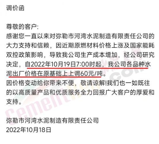 彌勒市河灣水泥制造有限責(zé)任公司發(fā)調(diào)價函稱,因近期原燃材料價格上漲及國家能耗雙控政策影響,導(dǎo)致公司生產(chǎn)成本增加,經(jīng)公司研究決定,自2022年10月19日7∶00時起,我公司各品種水泥出廠價格在原基礎(chǔ)上上調(diào)60元/噸。