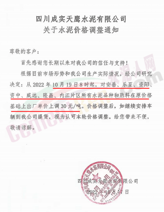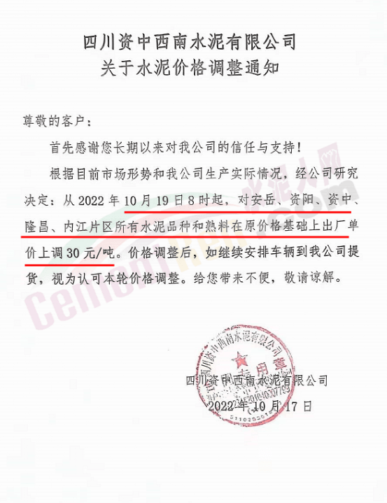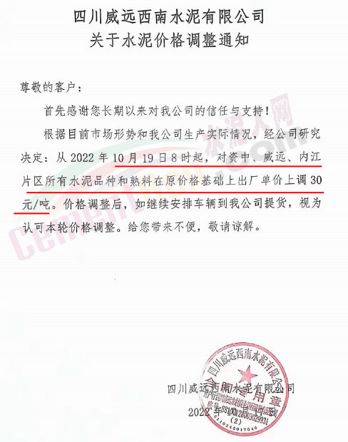 四川威遠(yuǎn)西南水泥、資中西南水泥、四川成實天鷹水泥通知,10月19日起,所有水泥品種和熟料價格上調(diào)30元/噸。