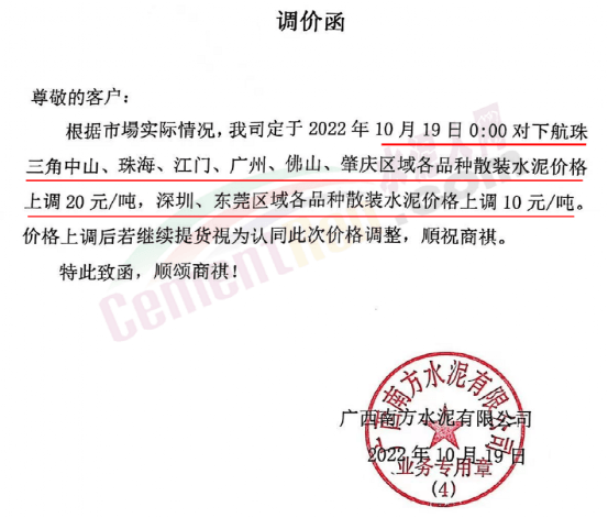 廣西南方水泥、廣東新南華水泥有限公司通知,10月19日0時起上調(diào)各標(biāo)號水泥10-20元/噸。