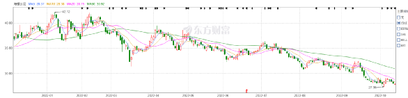 2022年內(nèi)最高值(2022年1月10日盤中最高價(jià)44.5元)到2022年10月20日開盤27.8元市值下跌了884.98億元。較2020年7月31日盤中最高63.5元,市值更是下跌了1895.03億元。
