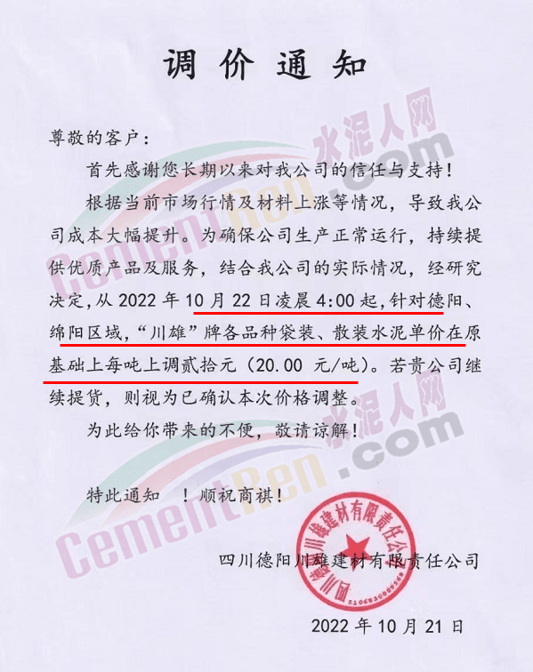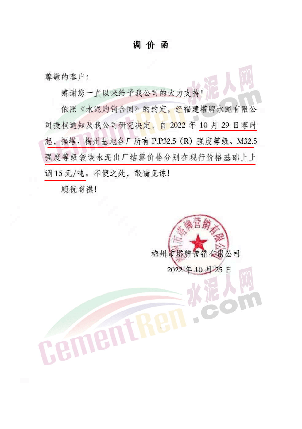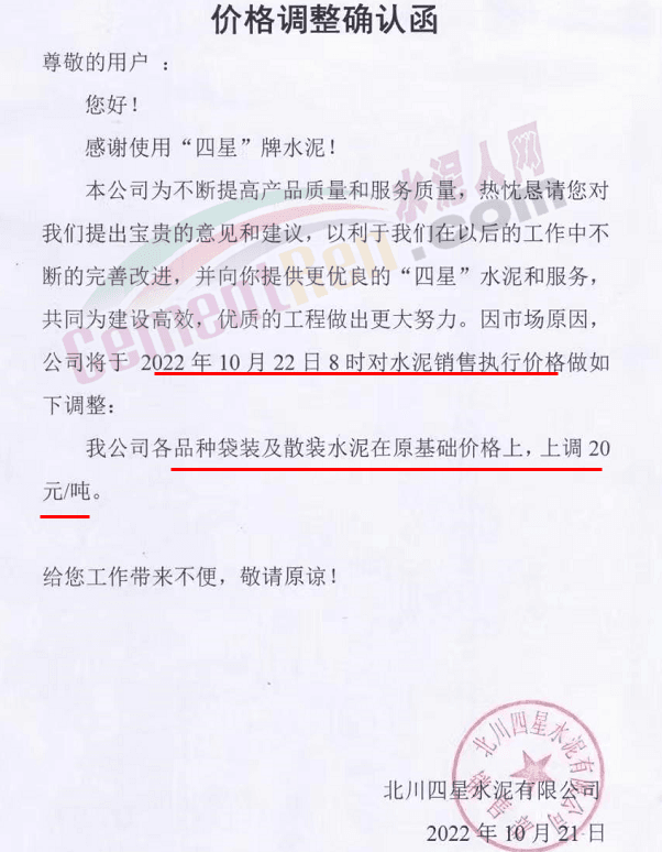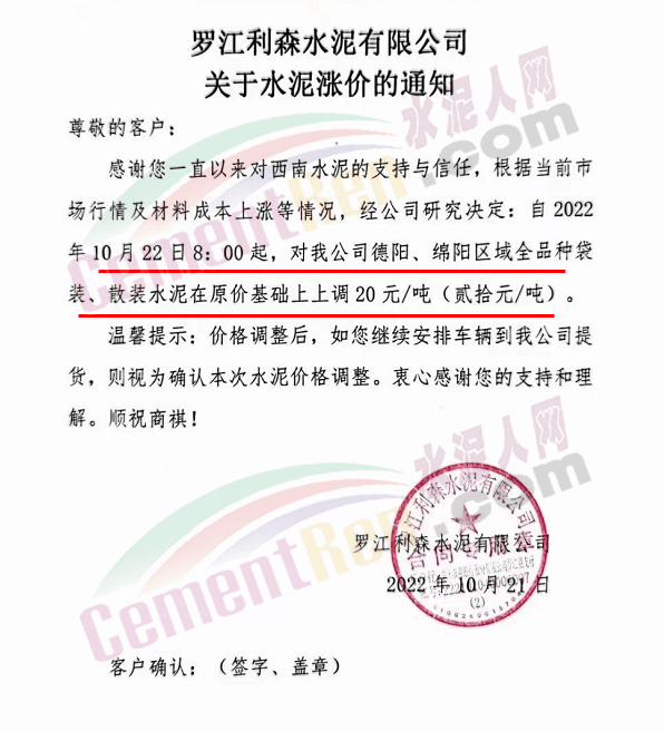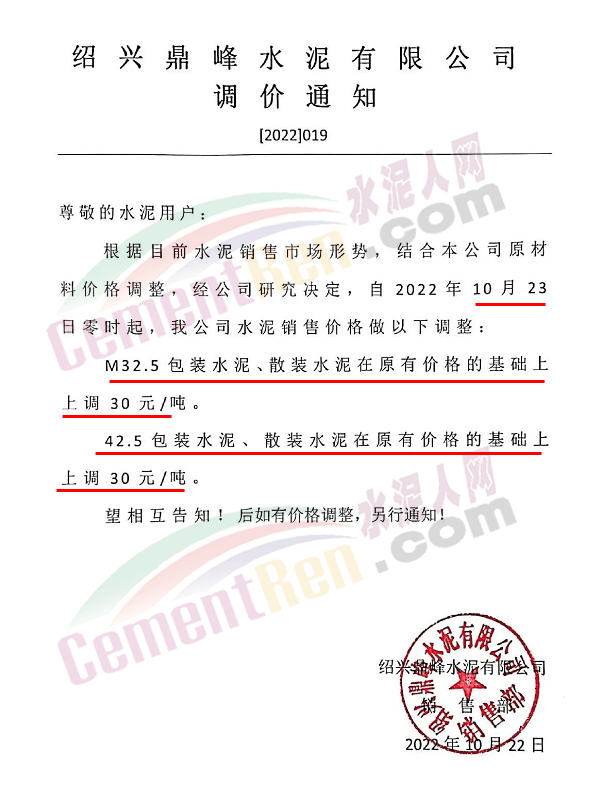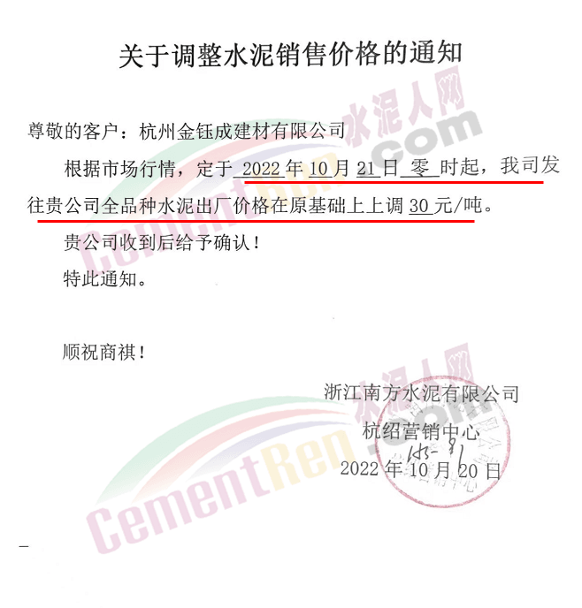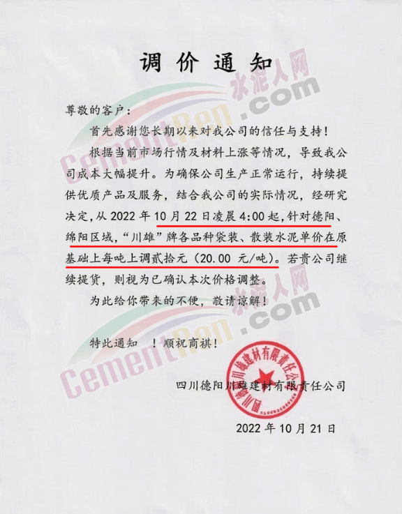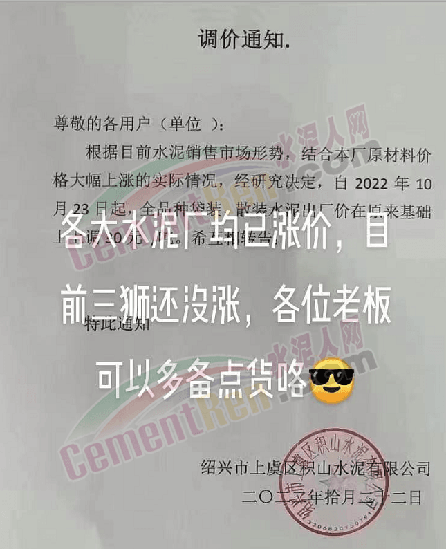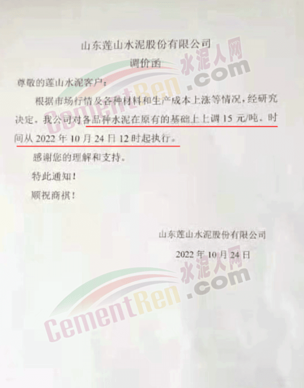 山東蓮山水泥股份有限公司通知,根據(jù)市場行情及各種材料和生產(chǎn)成本上漲等情況,經(jīng)研究決定,從10月24日起對各品種水泥在原基礎(chǔ)上上調(diào)15元/噸。