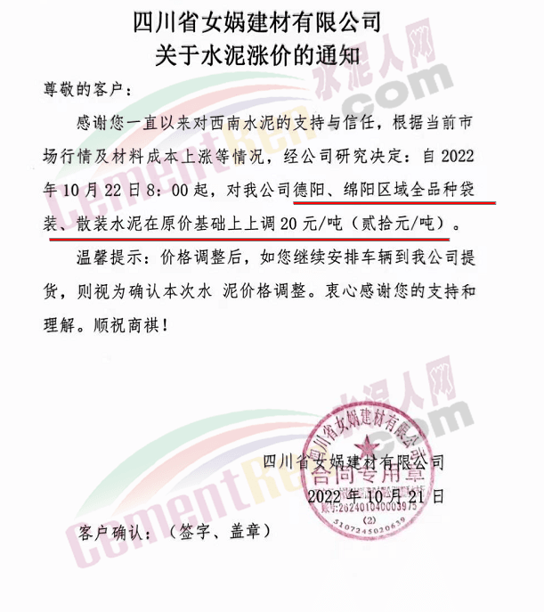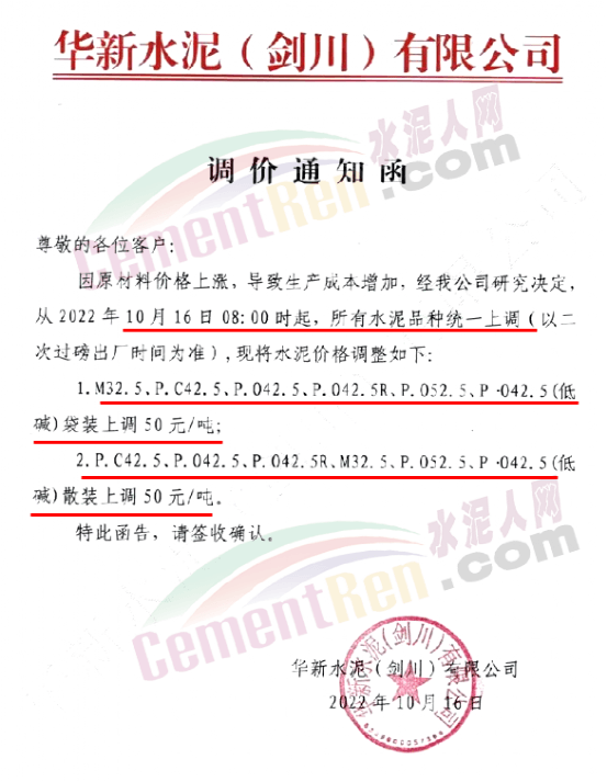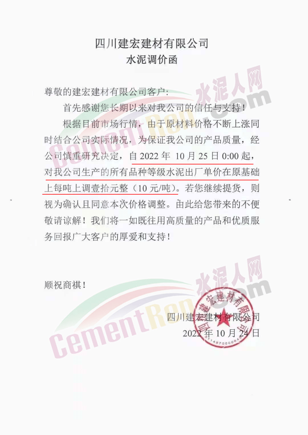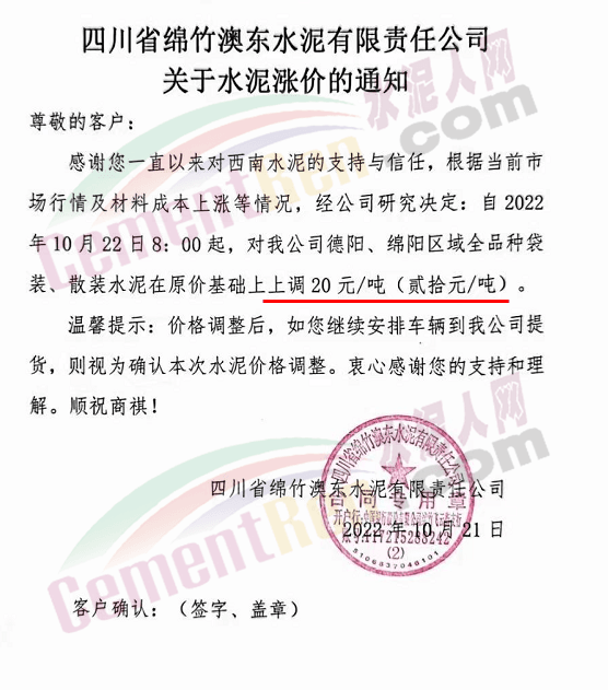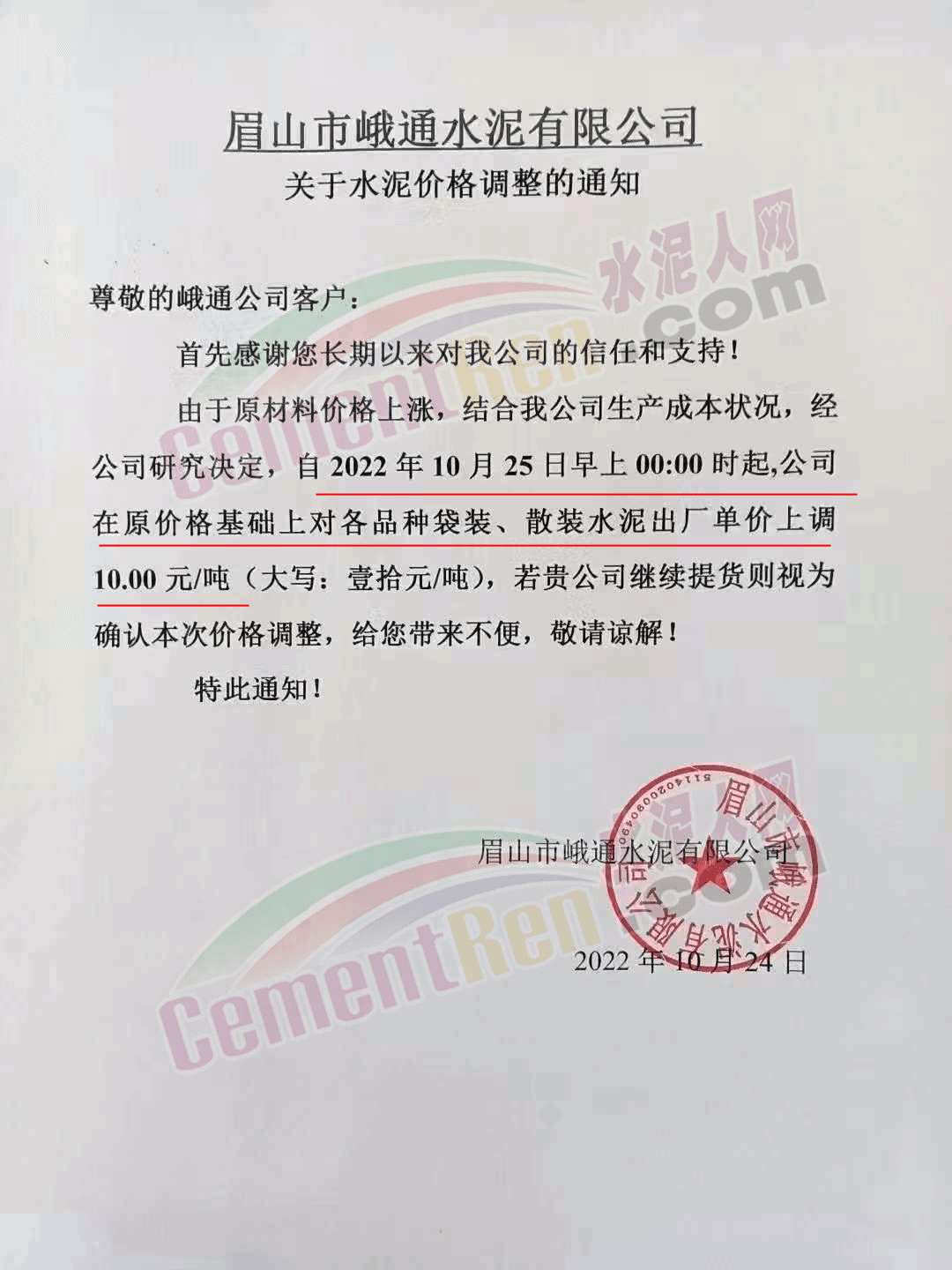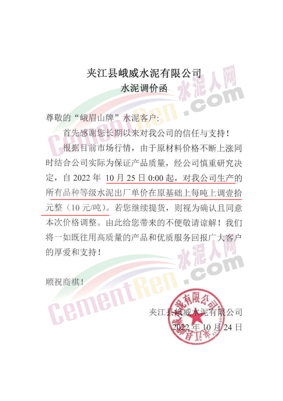 山東蓮山水泥股份有限公司通知,根據(jù)市場行情及各種材料和生產(chǎn)成本上漲等情況,經(jīng)研究決定,從10月24日起對各品種水泥在原基礎(chǔ)上上調(diào)15元/噸。