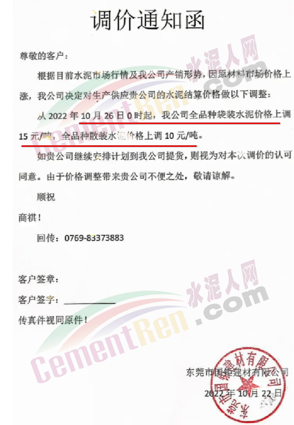 廣東東莞市國鉅建材有限公司通知26日0時起袋裝水泥上調(diào)15元/噸,散裝水泥上調(diào)10元/噸。