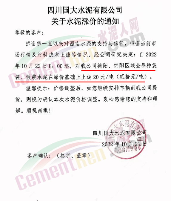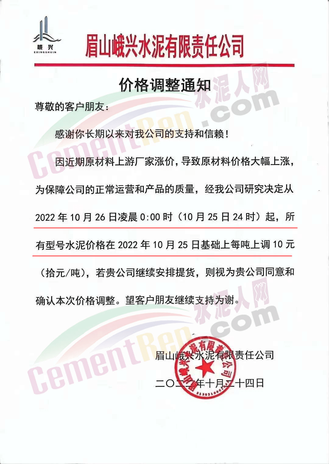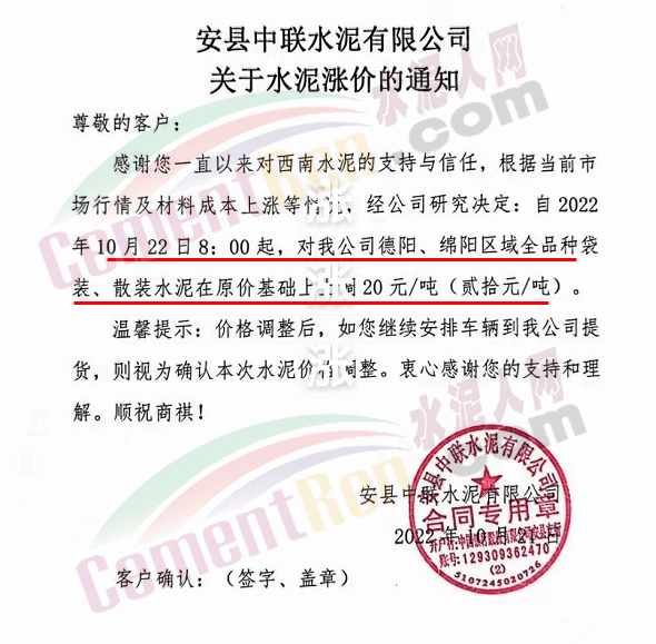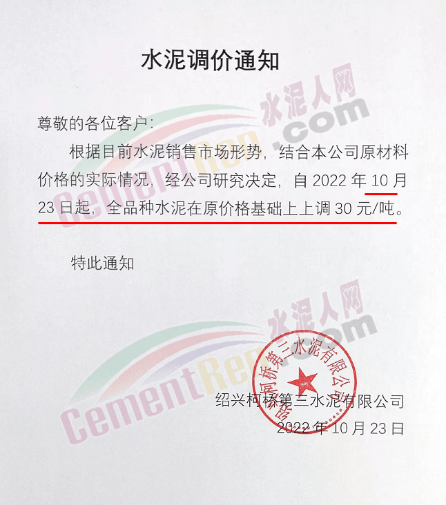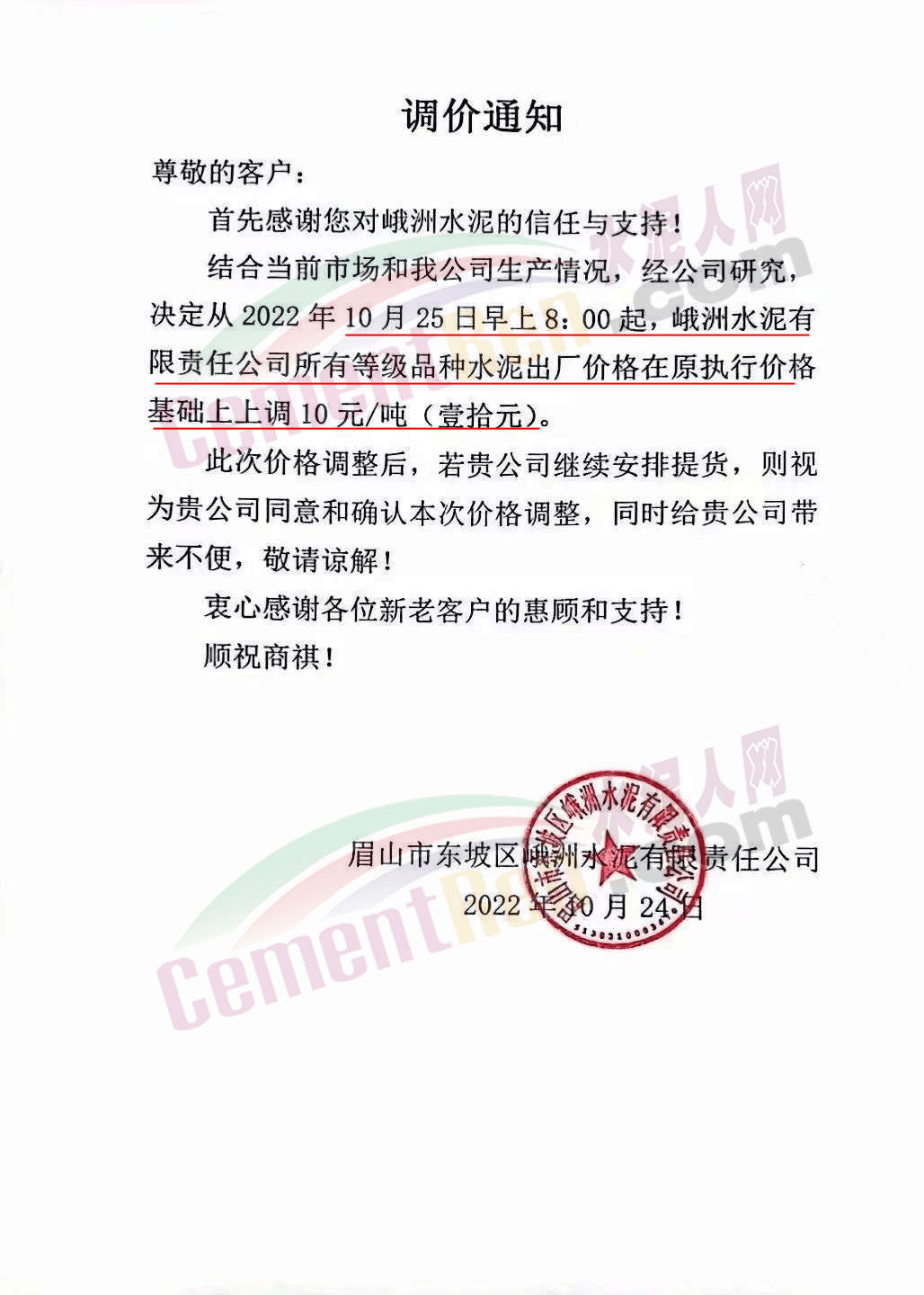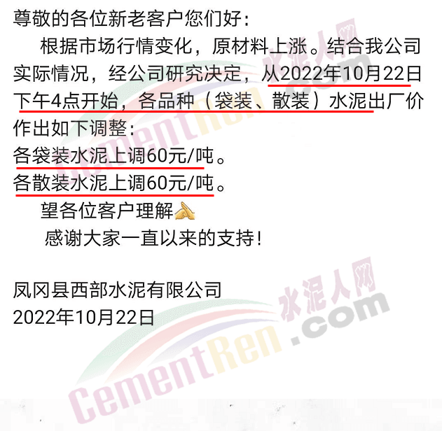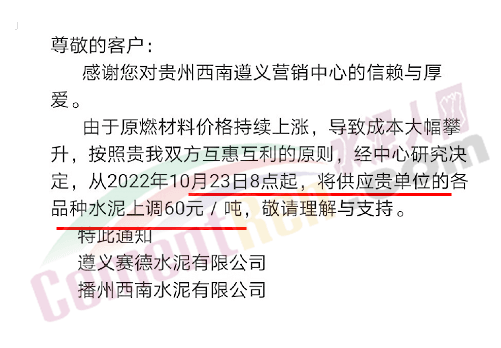 貴州西南遵義營銷中心通知,10月23日起各品種水泥價格上調(diào)60元/噸.
