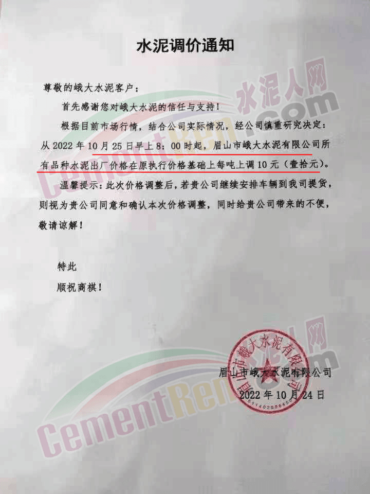 四川眉山多家水泥企業(yè)通知上調(diào)水泥價格10元/噸,經(jīng)銷商表示,這是“溫柔一刀”。