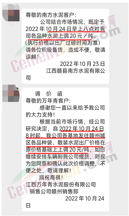 江西贛州區(qū)域主要品牌企業(yè)萬年青水泥、南方水泥通知24日起上調(diào)20元/噸。