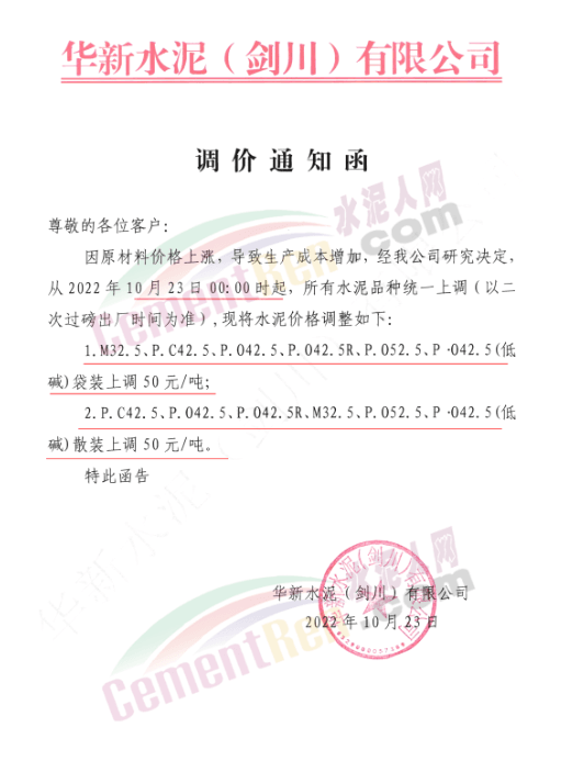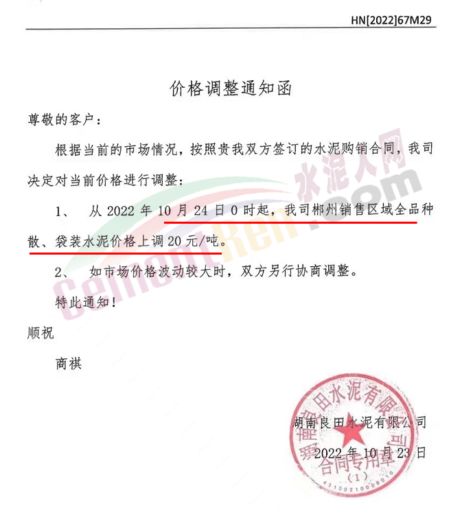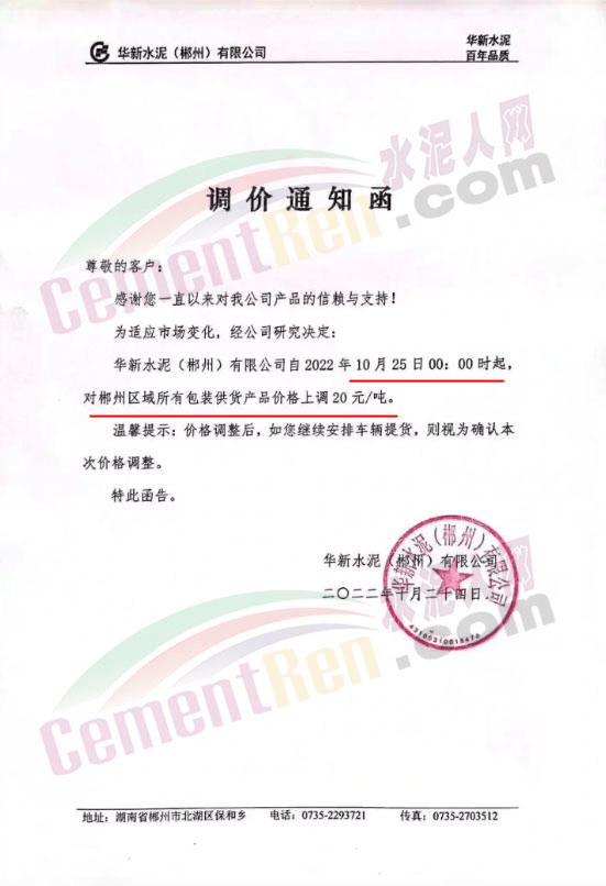 華新水泥(郴州)有限公司通知10月25日起對郴州區(qū)域所有包裝供貨價格上調(diào)20元/噸。
