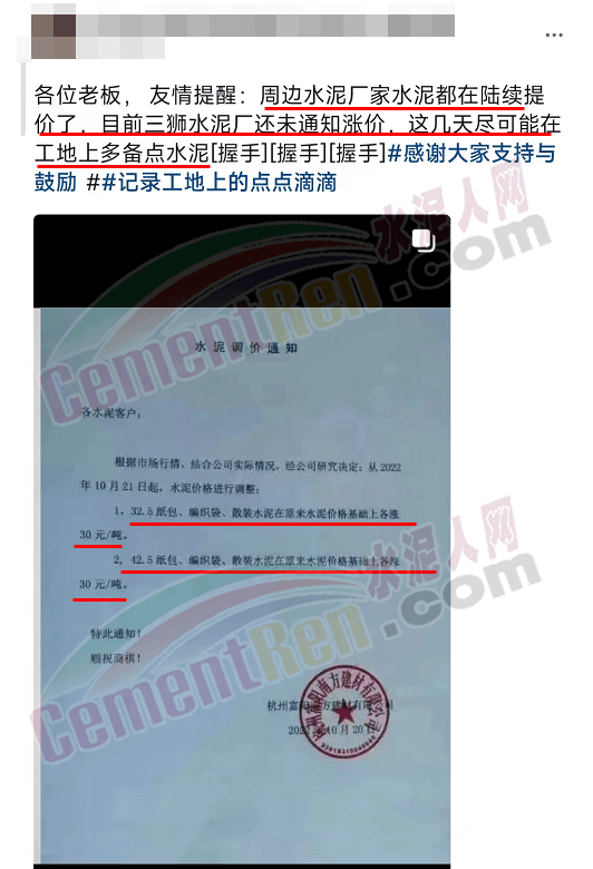 與此同時,華南廣東、廣西,華東江浙滬、江西、福建以及西南區(qū)域云、貴川等多區(qū)域主要品牌企業(yè)上調(diào)水泥價格。水泥人網(wǎng)注意到,部分經(jīng)銷商調(diào)價通知中提到“我們不能控制漲價,但我們有告知的責(zé)任,現(xiàn)在的價格,只能管現(xiàn)在” 。