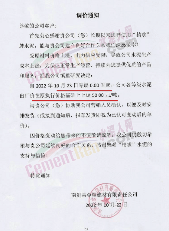云南省大理白族自治州南澗縣金球建材有限責(zé)任公司通知,受原材料價格上漲,電力供應(yīng)受限,導(dǎo)致公司水泥生產(chǎn)成本上漲。自10月23日0時起上調(diào)50元/噸。
