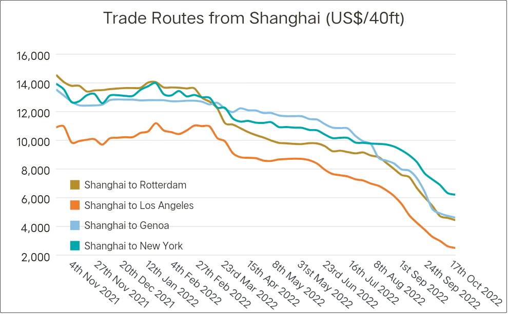 國際航運(yùn)市場,從去年的一船難求到如今的無人問津可見一斑,近日,上海至洛杉磯集裝箱指數(shù)正在斷崖式下跌;上海發(fā)往歐洲路特丹港的集裝箱指數(shù)也在急劇下跌;上海發(fā)往意大利熱那亞的集裝箱指數(shù)也難以幸免。這三個數(shù)據(jù)很明確的說明中國在太平洋、印度洋和大西洋的航運(yùn)指數(shù)正在急劇下降。