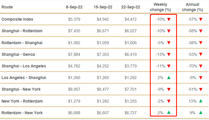 德路里的世界集裝箱運(yùn)價(jià)指數(shù)(WCI)已連續(xù)30周下降,較去年同期下跌57%。上海-熱那亞的運(yùn)費(fèi)下跌13%至6419美元/FEU;上海-洛杉磯的運(yùn)費(fèi)下跌11%至3779美元/FEU;上海-鹿特丹和上海-紐約的運(yùn)費(fèi)分別下降10%和9%至6027美元/FEU和7701美元/FEU。