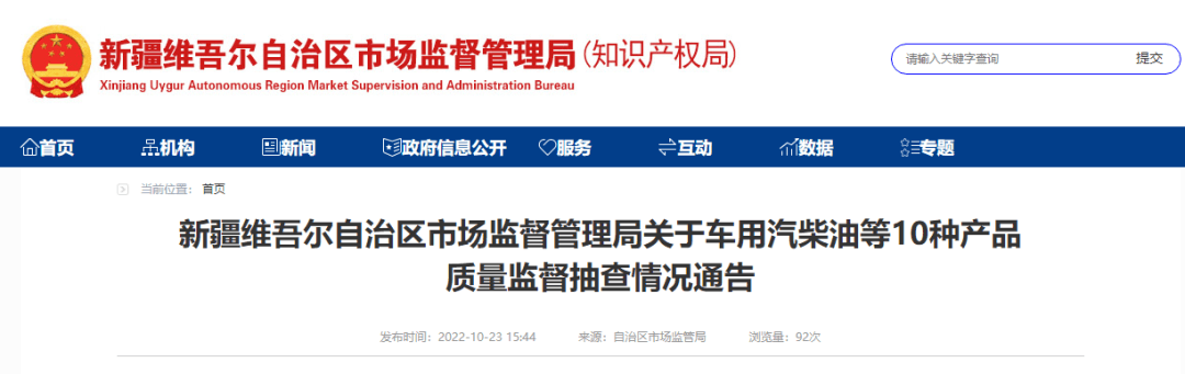 10月23日,新疆維吾爾自治區(qū)市場監(jiān)督管理局發(fā)布關(guān)于車用汽柴油等產(chǎn)品質(zhì)量監(jiān)督抽查情況通告。