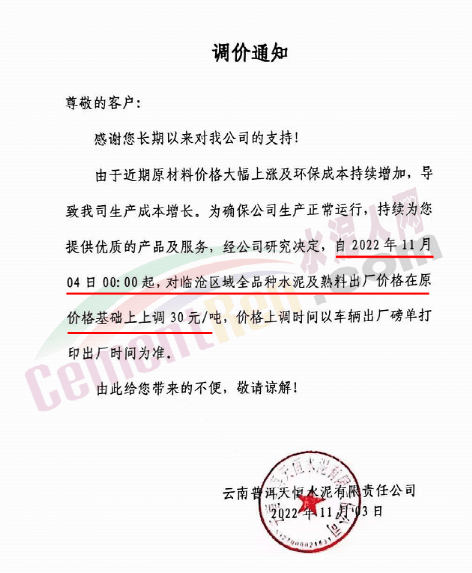 水泥人網(wǎng)消息:云南普洱天恒水泥有限責任公司通知由于近期原材料價格大幅上漲及環(huán)保成本持續(xù)增加,導致公司生產(chǎn)成本增長。為確保公司生產(chǎn)正常運行,經(jīng)公司研究決定,自2022年11月4日0時起,對臨滄區(qū)域全品種水泥及熟料出廠價格在原價格基礎上上調30元/噸,價格上調時間以車輛出廠磅單打印出廠時間為準。