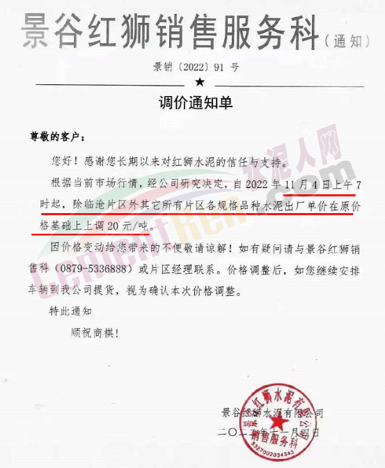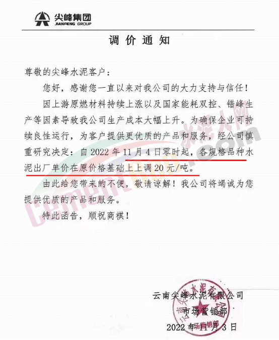 11月3日云南尖峰水泥有限公司市場營銷部通知,因上游原燃材料持續(xù)上漲以及國家能耗雙控、錯峰生產(chǎn)等因素導致公司生產(chǎn)成本大幅上升。為確保企業(yè)可持續(xù)良性運行,為客戶提供更優(yōu)質的產(chǎn)品和服務,經(jīng)公司慎重研究決定自2022年11月4日零時起,各規(guī)格品種水泥出廠單價在原價格基礎上上調20元/噸。